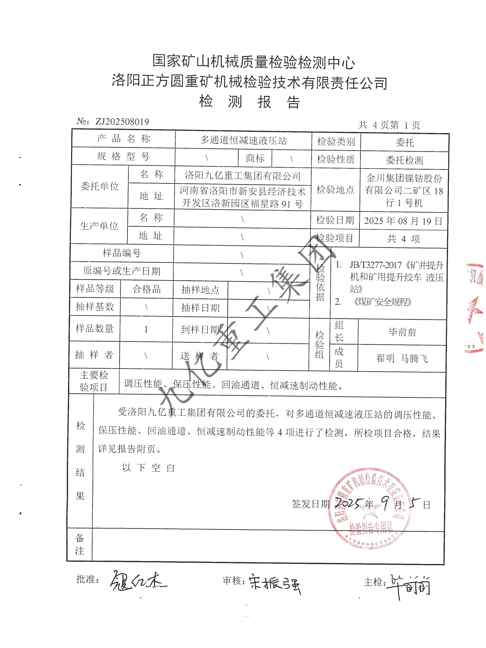 多通道恒減速液壓站檢驗(yàn)報告